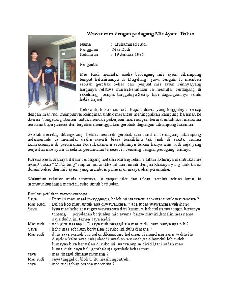 Dalam situasi wabah virus ini pedagang bakso ini tidak mengalami penurunan omset,masih setabil. Contoh makalah wawancara adalah makalah yang mungkin anda cari sebagai bahan contoh atau referensi dalam mengerjakan berbagai tugas maka. Saya terinspirasi dari kakak saya yang berdagang bakso di semarang.disana saya di ajarkan cara membuat bakso yang enak. Salam sahabat blogging skm, sekarang muhri kembali. Makalah kewirausahaan, wawancara kiat, strategi dalam berwirausaha.full description.