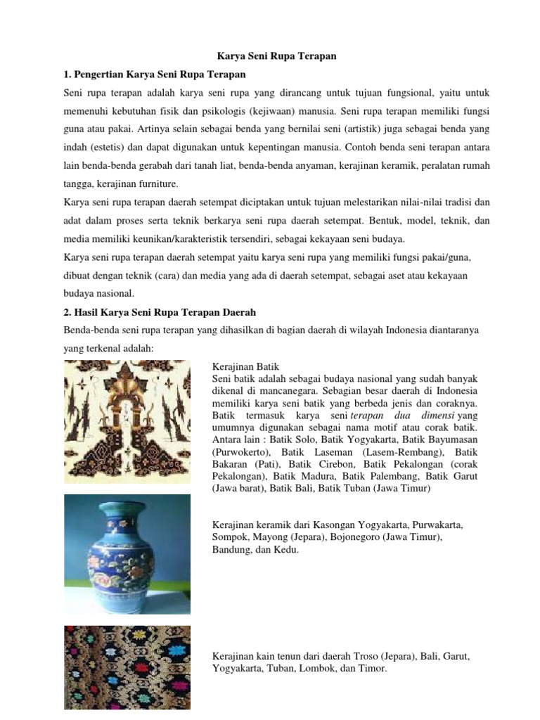 Rangkuman Seni Rupa Terapan Nusantara Pengertian Sejarah Singkat Fungsi Bentuk Makna Teknik Dan Contoh Karya Seni Rupa Terapan Nusantaran Ranking Kelas from 3.bp.blogspot.com Check spelling or type a new query. Maybe you would like to learn more about one of these? We did not find results for: Kain tenun adalah karya seni yang termasuk seni rupa terapan.