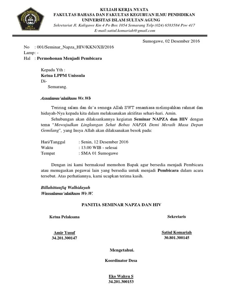Contoh surat permohonan menjadi pembicara dalam suatu acara kegiatan organisasi kampus, diskusi ilmiah, dialogue interactive, seminar, .